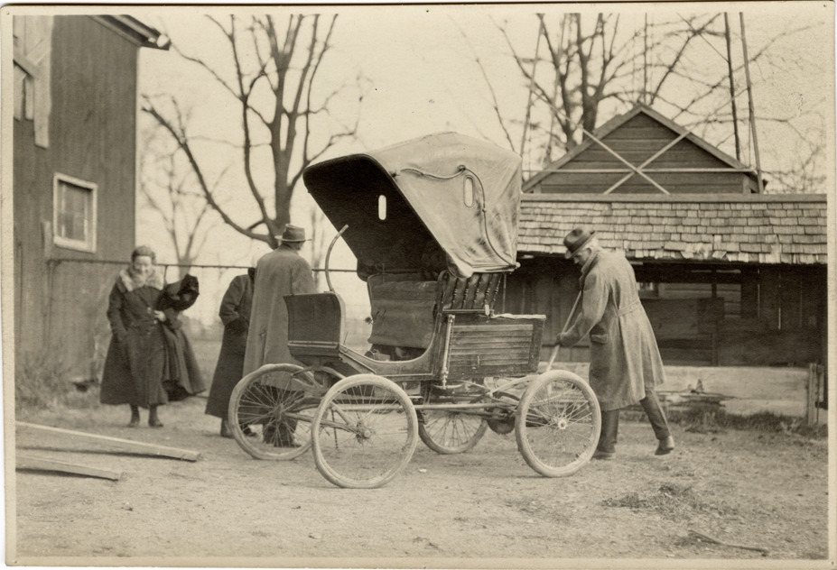 View of Henry Ford with Locomobile car at the Ralzemond A. Parker residence near Woodward Avenue and 13 Mile Road in Royal Oak, Michigan. R.A. Parker, his wife and unidentified woman in background. Handwritten on back: "Henry Ford, Locomobile. R.A. Parker. Royal Oak, Woodward/13 Mile Rd., 1923."