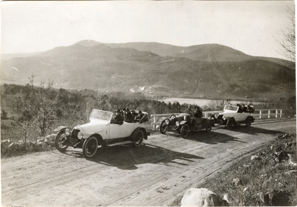 View of 1916 Owen Magnetic cars traveling on mountain road during a publicity tour. Stamped on back: "N. Lazarnick, photographer, 246 W. 42nd St., N.Y." Handwritten on back: "Owen-Magnetic, 1916. Three of the five Owen Magnetic cars which took part in the fall 1915 color tour in the Berkshires, an 800-mile run sponsored by the R.M. Owen Company of New York to promote the Owen Magnetic motor car. Twenty-six tourists participated in the tour. Cars: left to right. Owen Magnetic, Model O, 7-p. victoria touring. NY Dealer license plate 1915 M1376. Owen-Magnetic, Model O, 3-p. cloverleaf. NY Dealer license plate 1915 G1117. Owen Magnetic, Model O. 7-p. victoria touring."
