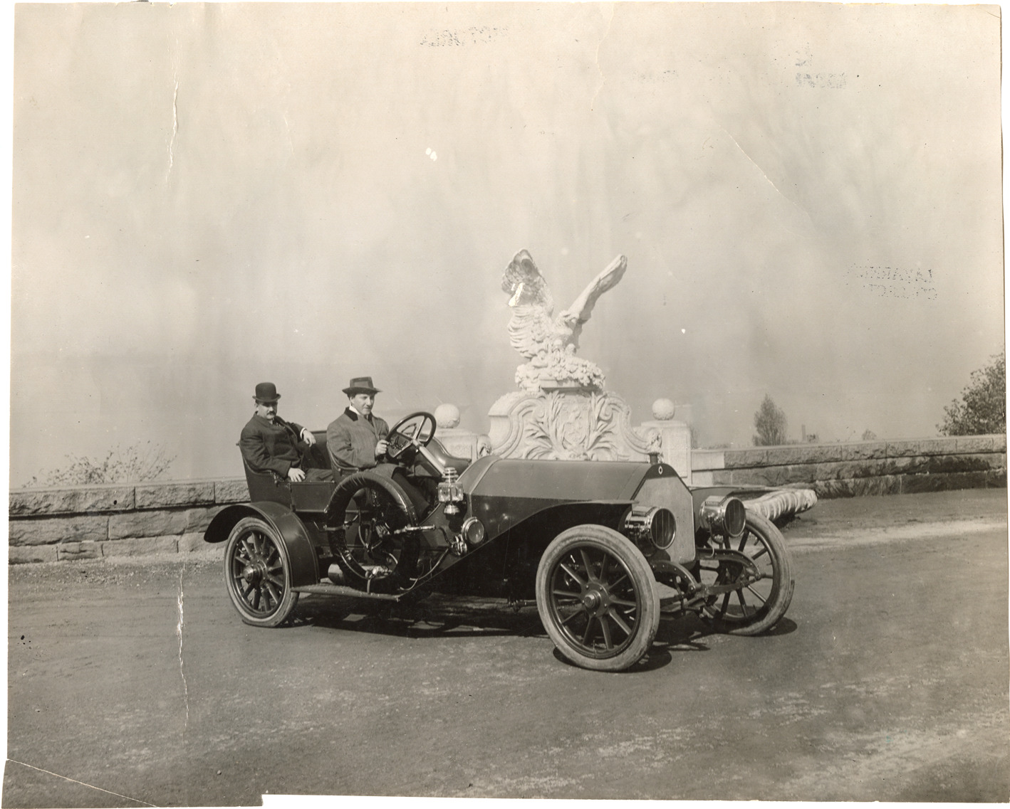 Favorite this☆ Motorists posing in 1909 Palmer-Singer automobile Description: View of motorists posing in a 1909 Palmer-Singer car; eagle sculpture and fountain in background. Handwritten on back: "Palmer & Singer, 1909." Details Resource ID: na047144 Subject: Automobiles Palmer & Singer Manufacturing Company Fountains Photographic prints Date Issued: Unknown year Format: 1 photographic print ; 7.5 x 9.5 in. Member of: National Automotive History Collection Lazarnick Collection Filing Location: General photograph files, Palmer-Singer Rights: Physical rights are retained by DPL. Copyright is retained in accordance with U.S. copyright laws.