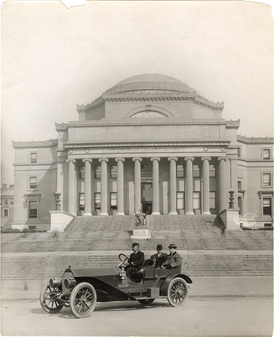 Favorite this☆ Motorists in 1909 Palmer-Singer automobile in front of Columbia University Library Description: View of motorists in 1909 Palmer-Singer car parked in front of Columbia University Library. Handwritten on back: "Palmer-Singer, 1909." Details Resource ID: na047150 Creator: Spooner & Wells Subject: Automobiles--New York (State)--New York Palmer & Singer Manufacturing Company Columbia University. Library Photographers--New York (State)--New York Photographic prints Date Issued: Unknown year Format: 1 photographic print ; 9.25 x 7.5 in. Member of: National Automotive History Collection Lazarnick Collection Filing Location: General photograph files, Palmer-Singer Rights: Physical rights are retained by DPL. Copyright is retained in accordance with U.S. copyright laws.