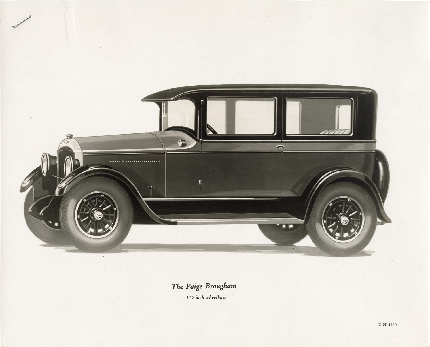 Artist's depiction of a 1929 Paige brougham. Printed on front: "Paige brougham, 115-inch wheelbase." Handwritten on back: "Paige, 1929."