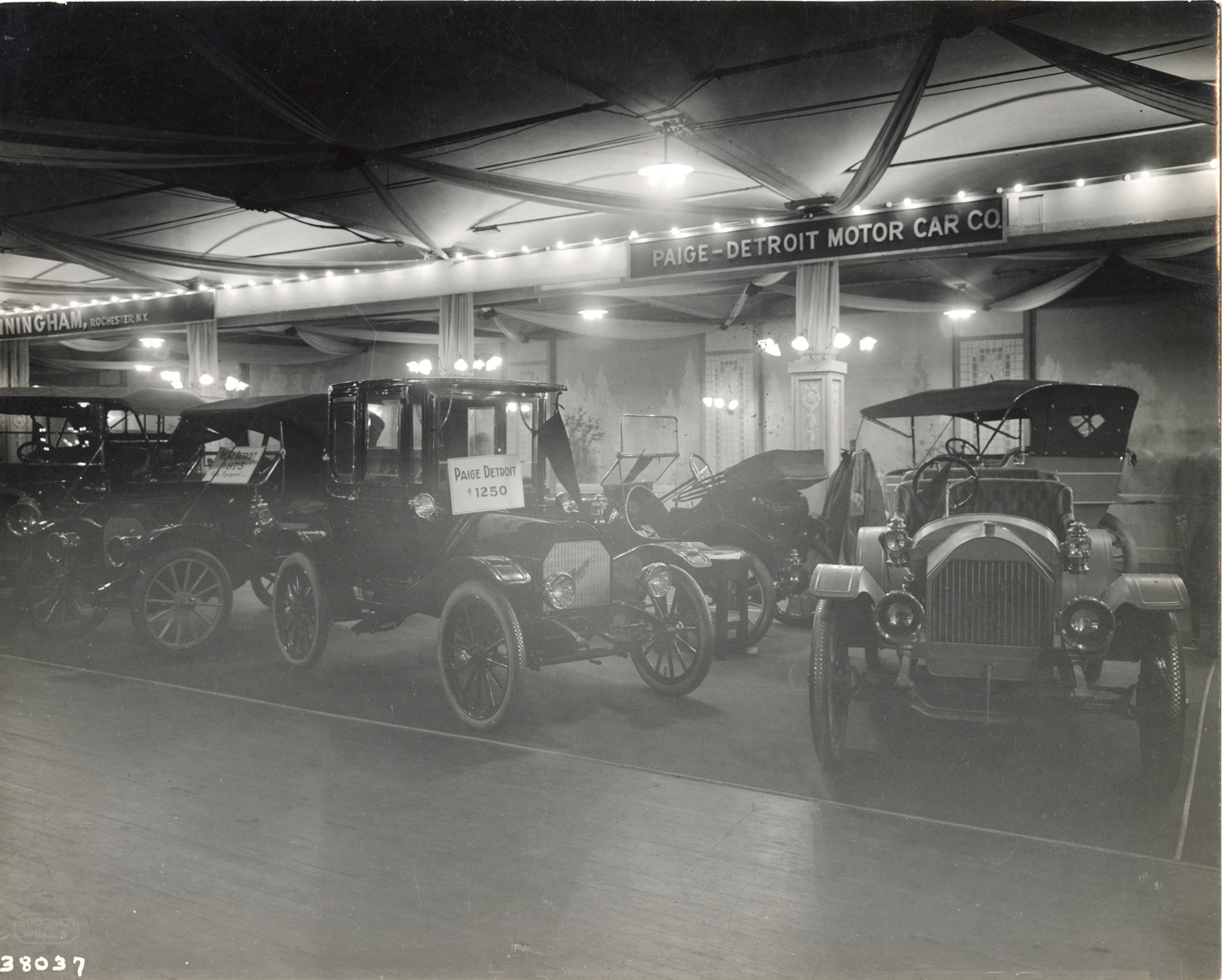 View of Paige-Detroit cars on display at trade show. "Paige-Detroit Motor Car Co." sign displayed over exhibit. Stamped on back: "Spooner & Wells, Inc., photographers, telephones 3472-3473 Columbus, 1931 Broadway, New York." Handwritten on back: "Paige, ca. 1910."