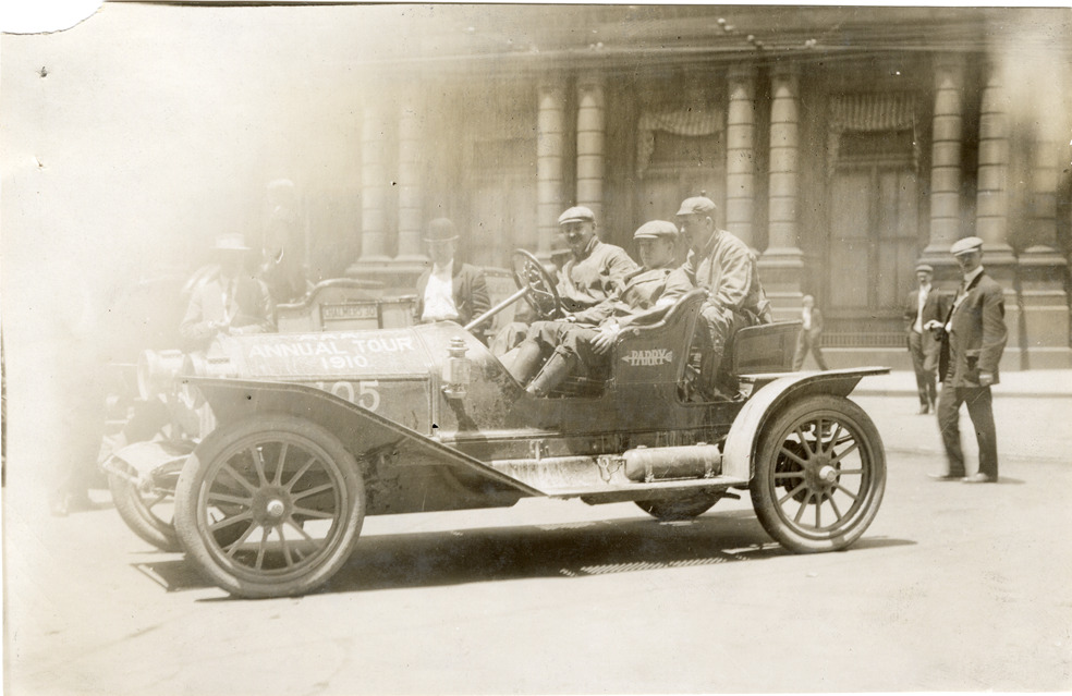 Motorists posing in Parry automobile, 1910 Glidden Tour