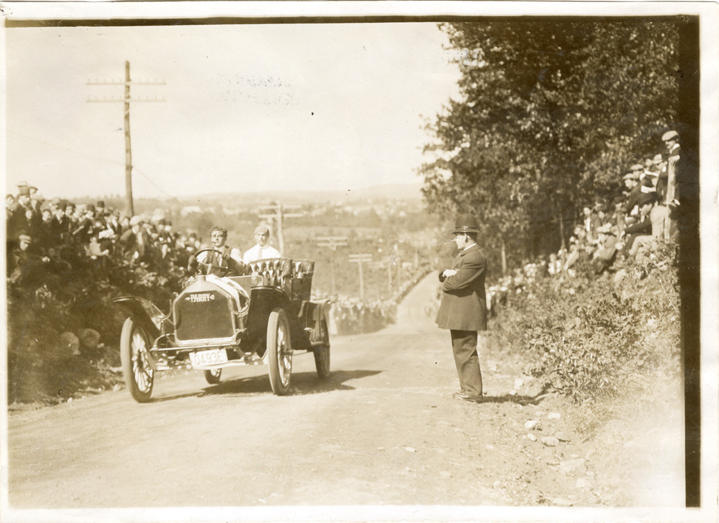 Motorists in 1910 Parry automobile passing spectators on roadside