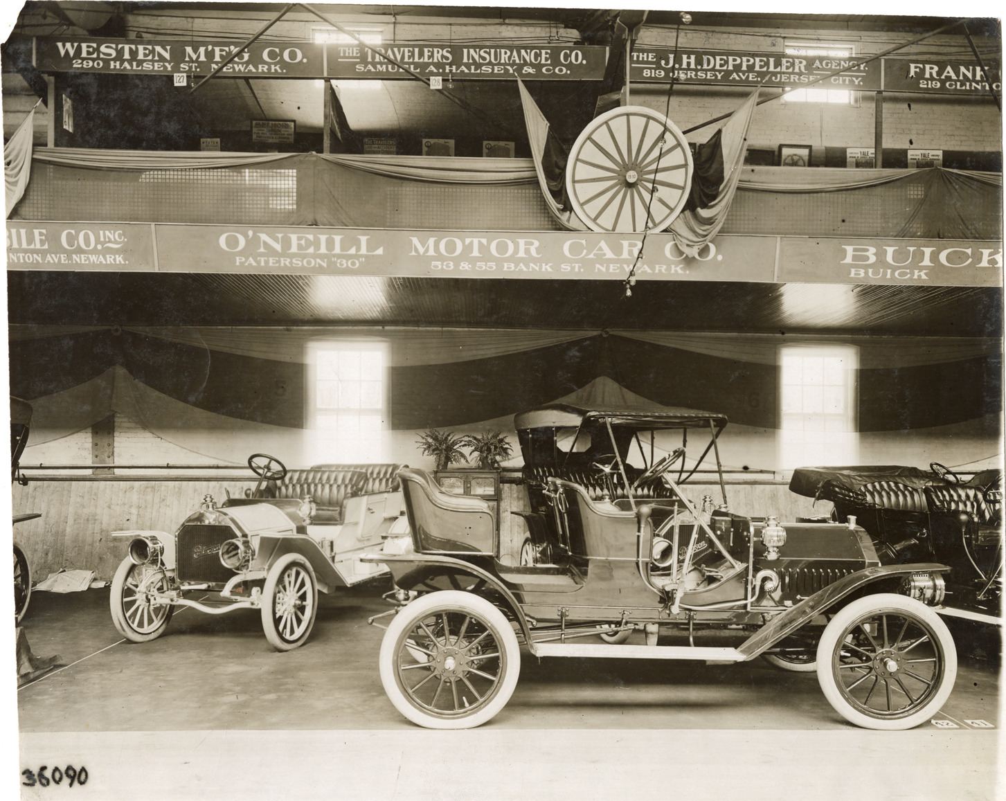 View of 1910 Paterson cars on display at trade show. "O'Neill Motor Car Co. Paterson '30'. 53 & 55 Bank St., Newark" sign is displayed over exhibit. Stamped on back: "Spooner & Wells, Inc., photographers, telephones 3472-3473 Columbus, 1931 Broadway, New York." Handwritten on back: "Paterson, 1910."