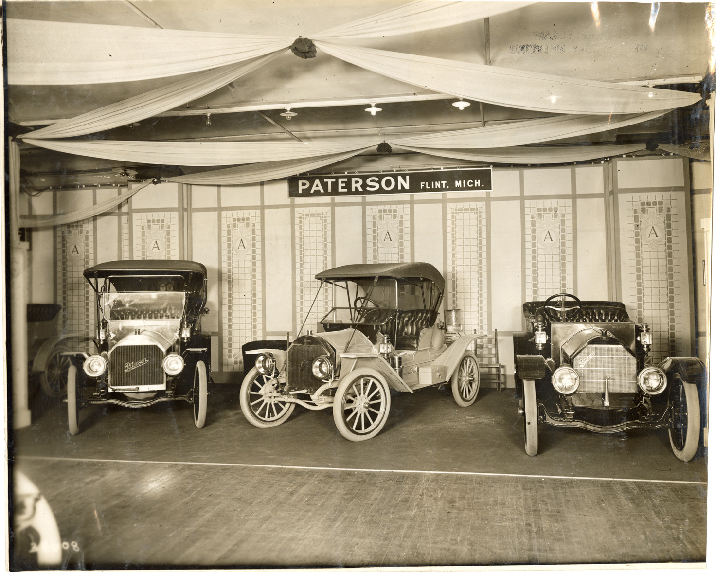 View of 1911 Paterson cars on display at trade show. "Paterson, Flint, Mich." sign is displayed over exhibit. Stamped on back: "Spooner & Wells, Inc., photographers, telephones 3472-3473 Columbus, 1931 Broadway, New York." Handwritten on back: "Paterson, 1911."
