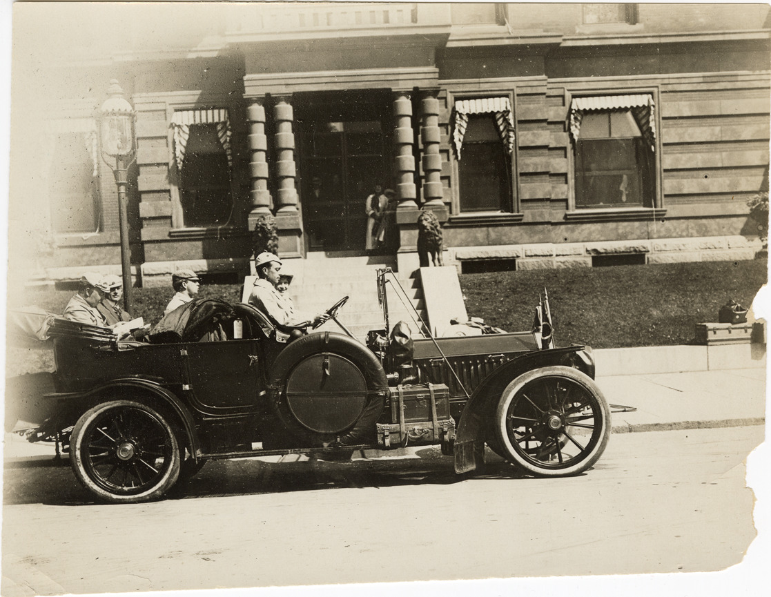 View of motorists in a 1908 Peerless car in front of the Rockingham Hotel at Portsmouth, New Hampshire. Stamped on back: "N. Lazarnick, photographic illustrations, 230 Park Avenue, New York Central Building, New York, N.Y. Tel. Vanderbilt 0011-12-13-14-15." Handwritten on back: "Peerless. Henry Caldwell, Duncan Curry, Vance Sharer at the Rockingham, Portsmouth, N.H. Peerless, 1908."