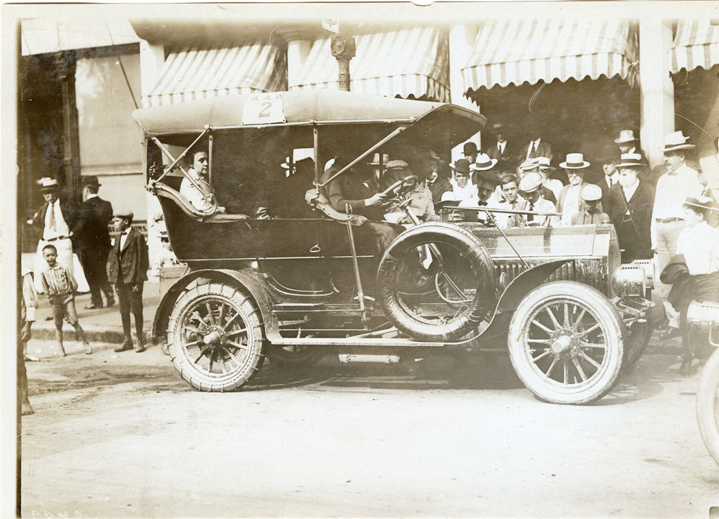 View of Percy Pierce and passengers in Pierce-Arrow car no. 27 during the 1906 Glidden Tour. Handwritten on back: "1906 Glidden Tour. 1906 Pierce Great Arrow. Model 28-32NN, 4 cy., 28-32 h.p. 5-p. straight tonneau body, $4,000; cape top $200 extra. Tour car #27. Third annual tour of the American Automobile Association for the Glidden Trophy from Buffalo to Bretton Woods, N.H., via Saratoga, Lake Champlain, Montreal & Quebec. Miles: 1135. For 2nd straight year, the Glidden Trophy was won by the American Automobile Club of Buffalo. Photograph taken in front of the Teck Theatre in Buffalo, at the start of the 1906 Glidden Tour. Driver: Percy Pierce."