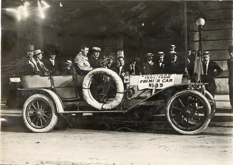 Favorite this☆ Motorists posing in Chairman's Premier automobile, 1909 Glidden Tour Description: View of motorists posing in Chairman's Premier car no. 99, during the 1909 Glidden Tour. Onlookers in background. Handwritten on back; "Premier, ca. 1909." Details Resource ID: na047297 Subject: Automobiles Premier Motor Manufacturing Company Glidden Tour (1909) Automobile driving--Competitions--United States Photographic prints Date Issued: 1909-07 Format: 1 photographic print ; 4.75 x 6.5 in. Member of: National Automotive History Collection Lazarnick Collection Filing Location: General photograph files, Premier, 1909 Rights: Physical rights are retained by DPL. Copyright is retained in accordance with U.S. copyright laws.