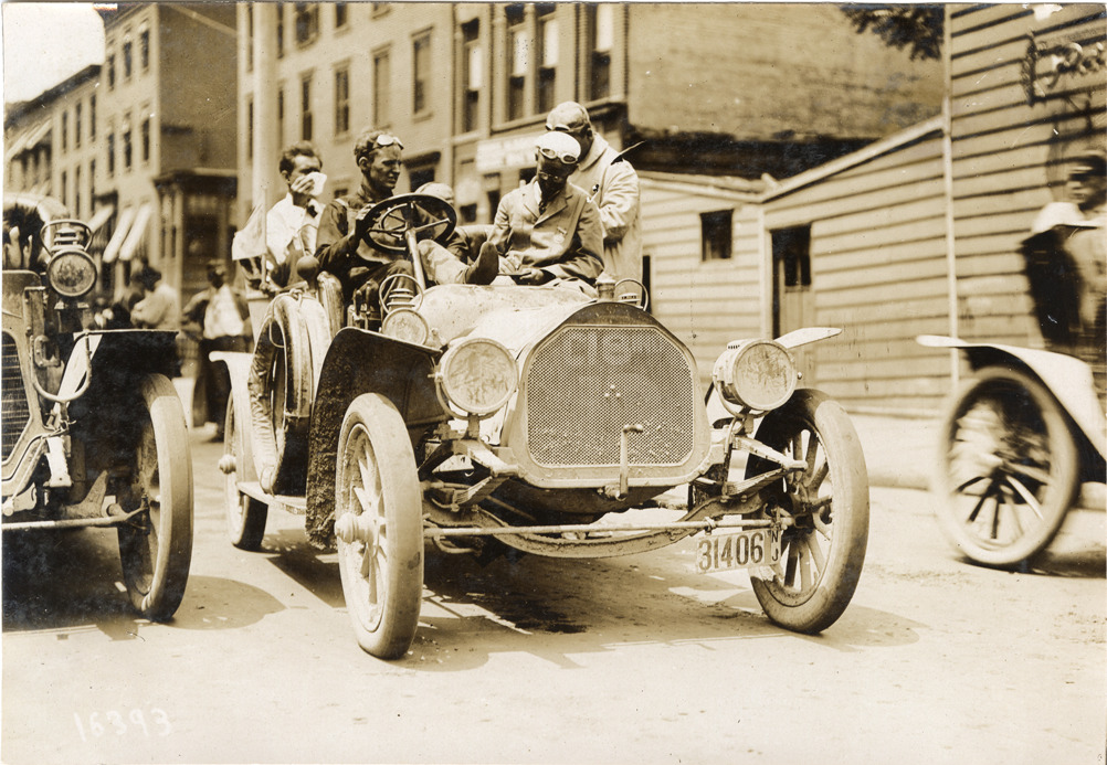 View of motorists in a Premier car during the 1907 Glidden Tour. Handwritten on back; "Premier, ca. 1907. Glidden."