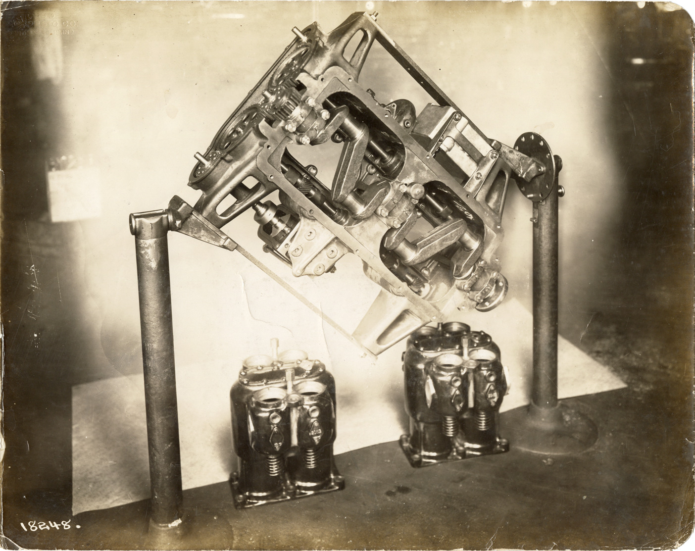 View of the engine for a Premier car. Label on back: "Premier assembly frame, allowing crank case complete with cylinders to be rotated." Handwritten on back; "Premier, ca. 1910-12."
