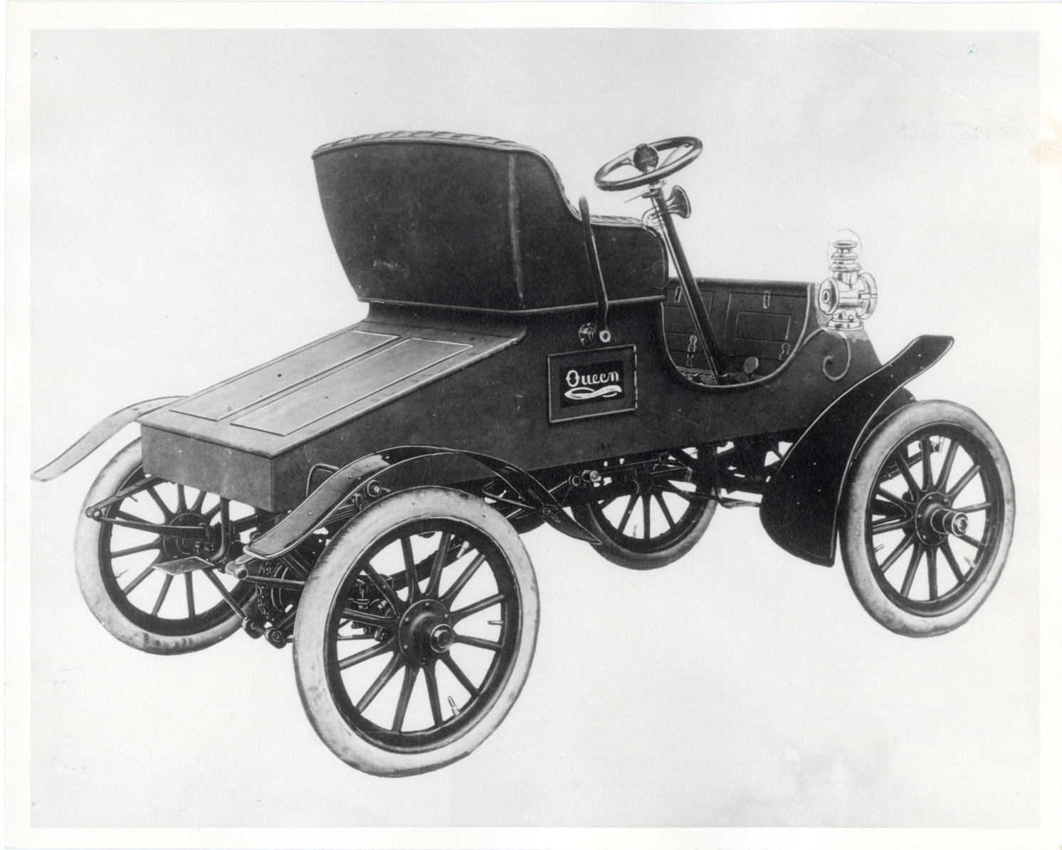 View of a Queen runabout. Handwritten on back: "C.H. Blomstrom. Queen, Model A runabout. Single cylinder engine, 1903. Queen, Model B runabout. Two-cylinder engine. 1903."