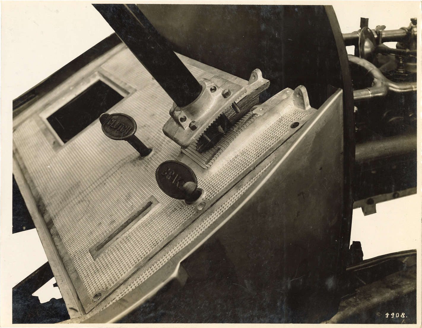 View of the steering column and clutch adjustment on a 1909 Rambler Model 44 car. Typed on back: "Model Forty-Four Rambler steering pillar and clutch adjustment." Handwritten on back: "Rambler, 1909."