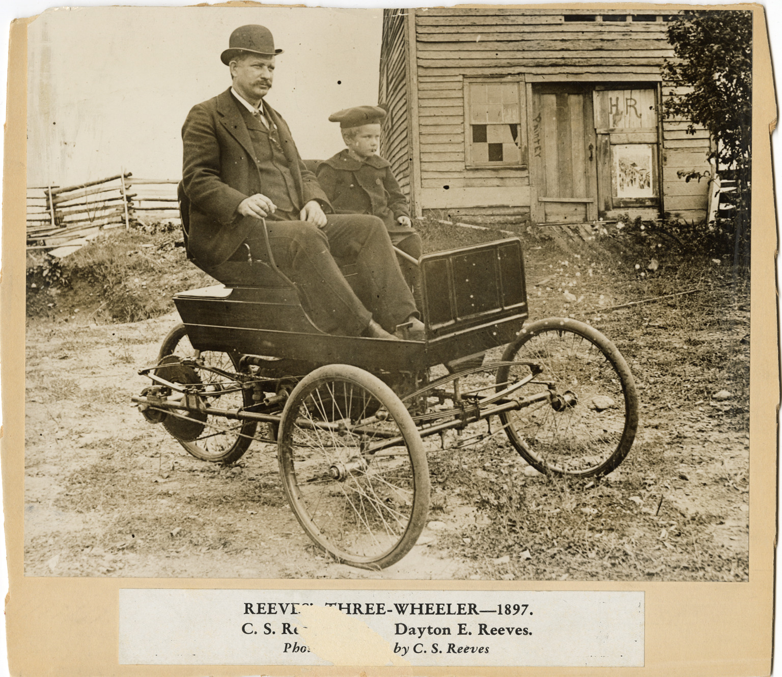 View of a man and boy posing in an 1897 Reeves three-wheeled automobile. Printed on front: "Reeves three-wheeler, 1897. C.S. Reeves; Dayton E. Reeves. Pho[?] by C.S. Reeves." Handwritten on back: "Reeves."