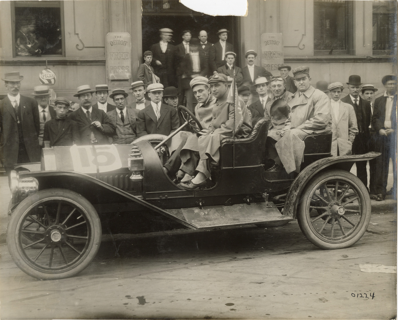 View of motorists posing in Regal car no. 15 in front of the Detroit Free Press building. Onlookers in background. Stamped on back: "Spooner & Wells, Inc., photographers, telephone North 1745. 1231 Woodward Ave., Detroit, Mich. Detroit, 1231 Woodward, New York, 1931 Broadway." Handwritten on back: "Regal, ca. 1910."