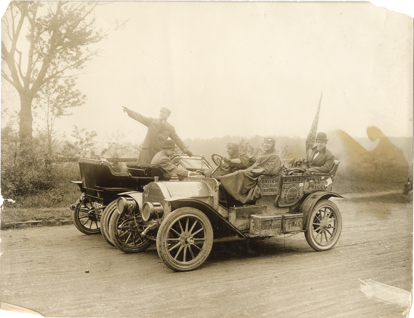 View of motorists in an unidentified car bidding farewell to motorists in a 1910 Regal 30 "Plugger" car during the 1909 New York to San Francisco tour. Stamped on back: "Photo by N. Lazarnick. 244-6-8 W. 42nd Street, N.Y. Tel. 594 Bryant. In ordering duplicates mention number on back of this print." Handwritten on back: "Bidding pilots good-bye on road to Phila. Regal, 1910. Plugger. New York to San Francisco tour, 1909."