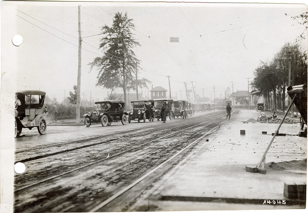 View of a group of automobiles traveling through Detroit, during a visit of delegates from the Upper Peninsula. The two-day visit was hosted by the Detroit Board of Commerce. Stamped on back: "Spooner & Wells, Inc., photographers, 1231 Woodward Ave., Detroit, Mich., telephone North 1745." Handwritten on back: "Northerners visit to Detroit, Sept. 7, 1911."