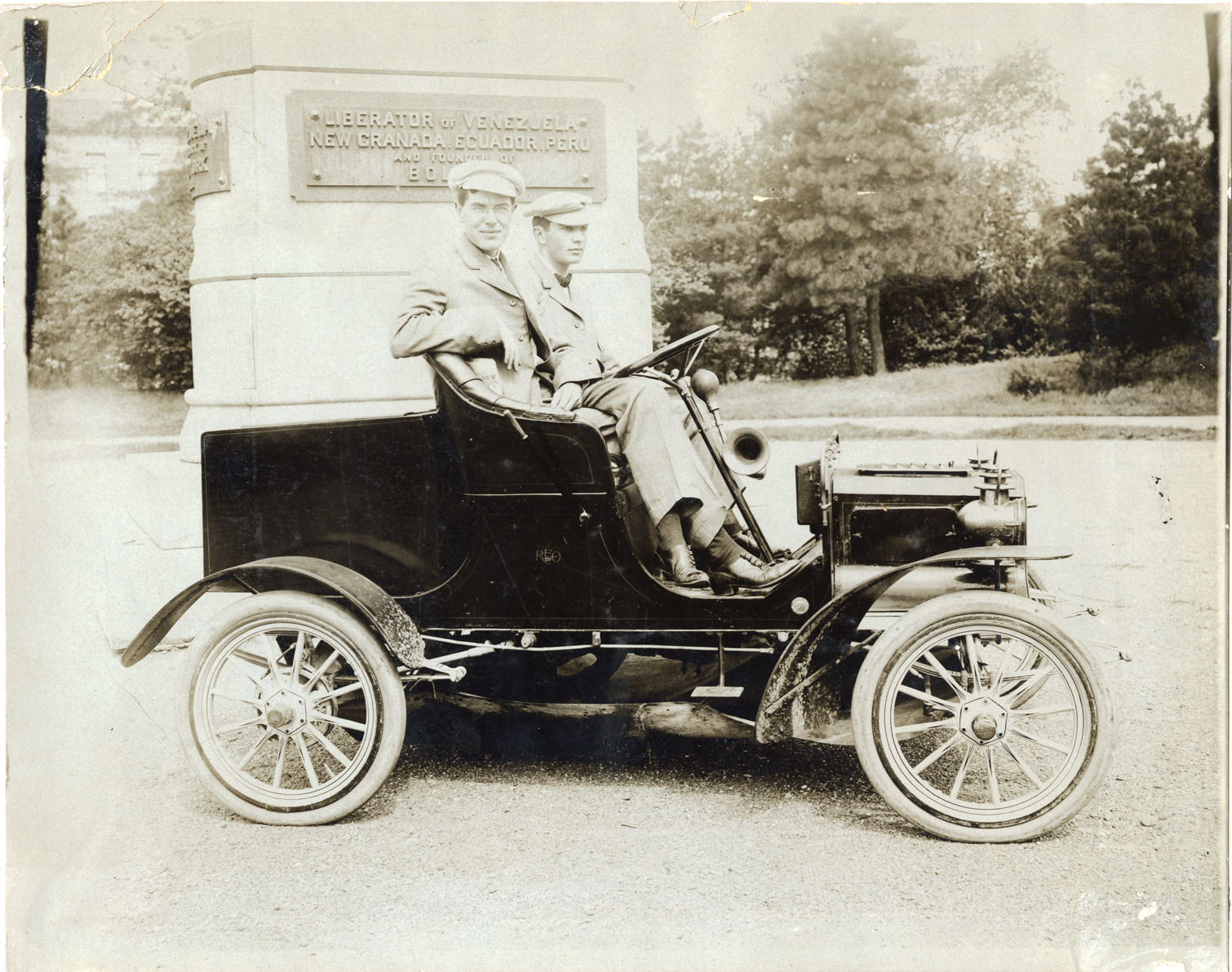 View of motorists posing in a Reo car. Plaque on stone pedestal in background reads: "Liberator of Venezuela, New Granada, Ecuador, Peru and founder of Bolivia." Stamped on back: "Photo by F. Ed. Spooner, 1536 B'way, telephone 6536-38th St., New York, N.Y." Handwritten on back: "Reo, ca. 1905."