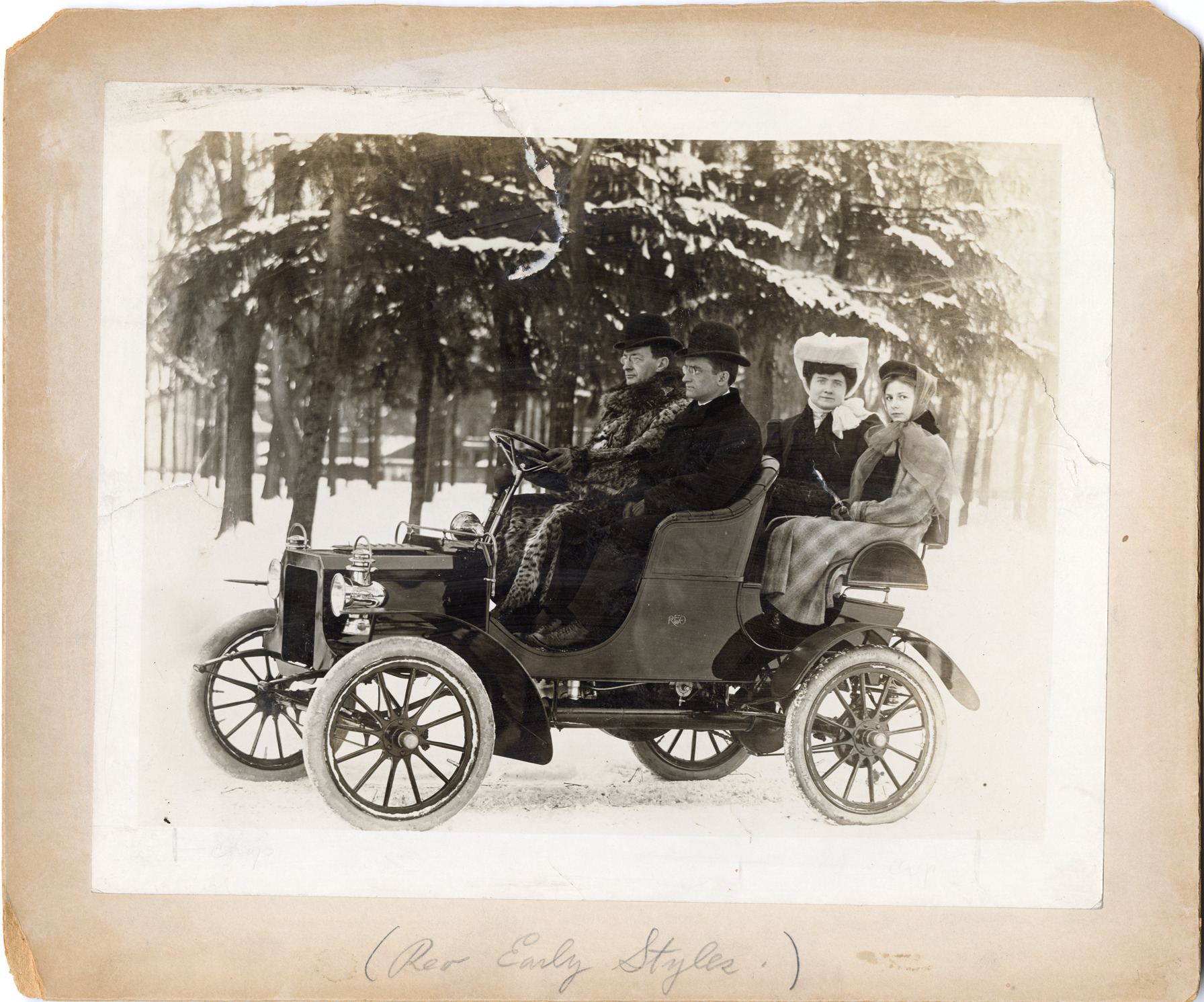 Favorite this☆ Motorists posing in 1905 Reo automobile Description: View of motorists posing in a 1905 Reo car. Driver wears a fur coat. Handwritten on front: "Reo early styles." Handwritten on back: "Early Reo model. Reo, 1905." Details Resource ID: na047489 Subject: Automobiles Reo Motor Car Company Fur garments Photographic prints Date Issued: Unknown year Format: 1 photographic print mounted on mat board ; image 8 x 10 in. Member of: National Automotive History Collection Filing Location: Reo, 1905 Negative Number: 14,659 F-2 Rights: Physical rights are retained by DPL. Copyright is retained in accordance with U.S. copyright laws.