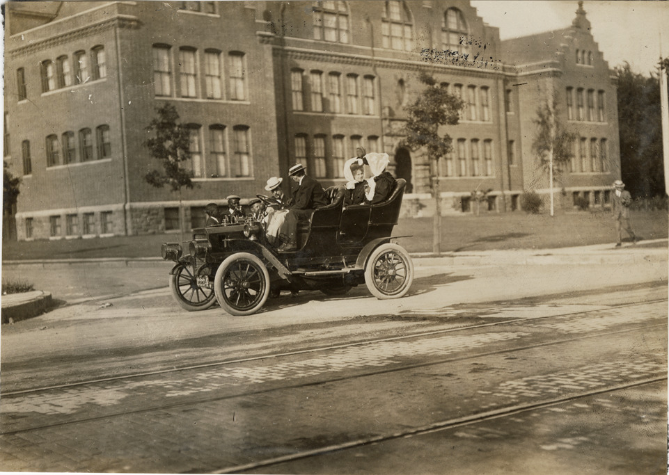 William J. Morgan and motorists in 1906 Reo automobile