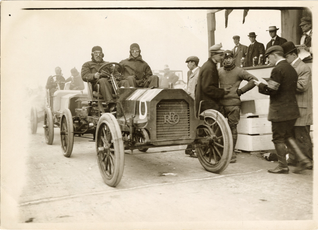 View of A.F. Camacho and passenger posing in Reo car no. N8 at the Long Island Motor Parkway. Stamped on back: "Photo by N. Lazarnick, 29 West 42nd Street, N.Y., tel. 594 Bryant." Handwritten on back: "Camacho, Reo. Motor Parkway, 1908."