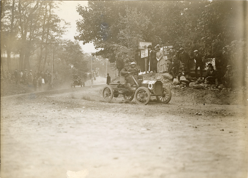 View of A.F. Camacho and passenger racing Reo car at the Long Island Motor Parkway. Spectators and signs on roadside. Stamped on back: "Photo by N. Lazarnick, 29 West 42nd Street, N.Y., tel. 594 Bryant." Handwritten on back: "Camacho, Reo. Motor Parkway, 1908."