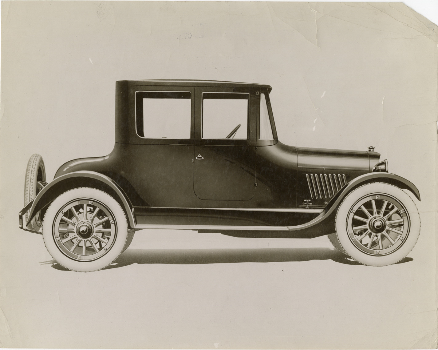 Artist's depiction of a 1919 Reo coupe. Label on back: "Reo, four passenger, four cylinder coupe. Price $2175." Handwritten on back: "Reo, 1919."