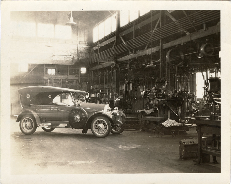 View of a 1924 ReVere touring car. Handwritten on back: "ReVere, 1924. Series 'M' cars powered by a modified 4-cy. Rochester Duesenberg Model G-1 engine known as the 'Monsen' engine. Series 25 cars powered by 6-cy. Model 6-J Continental engine. 5-p. touring car. Note: 1. unusual 4-prong radiator cap. 2. Special adjustable parking lights mounted atop the headlights & controlled from the dash. Photograph dated 12 Feb'y. 1924."