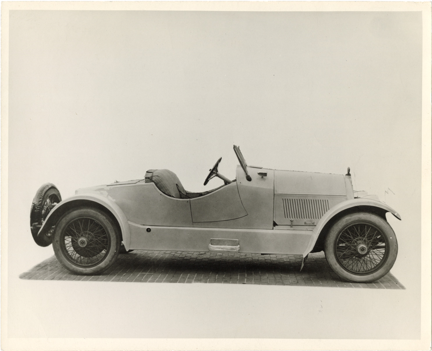 View of a 1920 ReVere speedster. Handwritten on back: "1920 ReVere. Powered by 4 cy. Model G-1 Rochester-Duesenberg engine with a claimed horsepower rating of 100. 131" whb. 2/3-p. speedster."