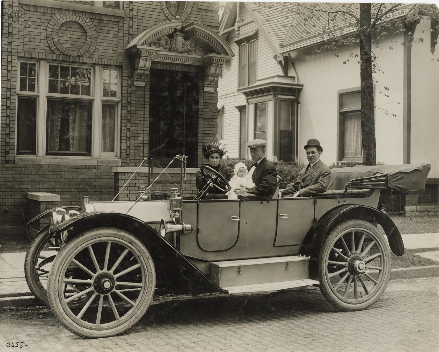 View of Ty Cobb and his wife and baby with Walter Bemb, president of Houdaille-Hershey Corporation, in a 1910 Owen car. Stamped on back: "Spooner & Wells, Inc., photographers, telephone North 1745. 1231 Woodward Ave., Detroit, Mich. Detroit, 1231 Woodward, New York, 1931 Broadway." Handwritten on back: "The Cobb family and Mr. Bemb, 1910. Owen, 1910."