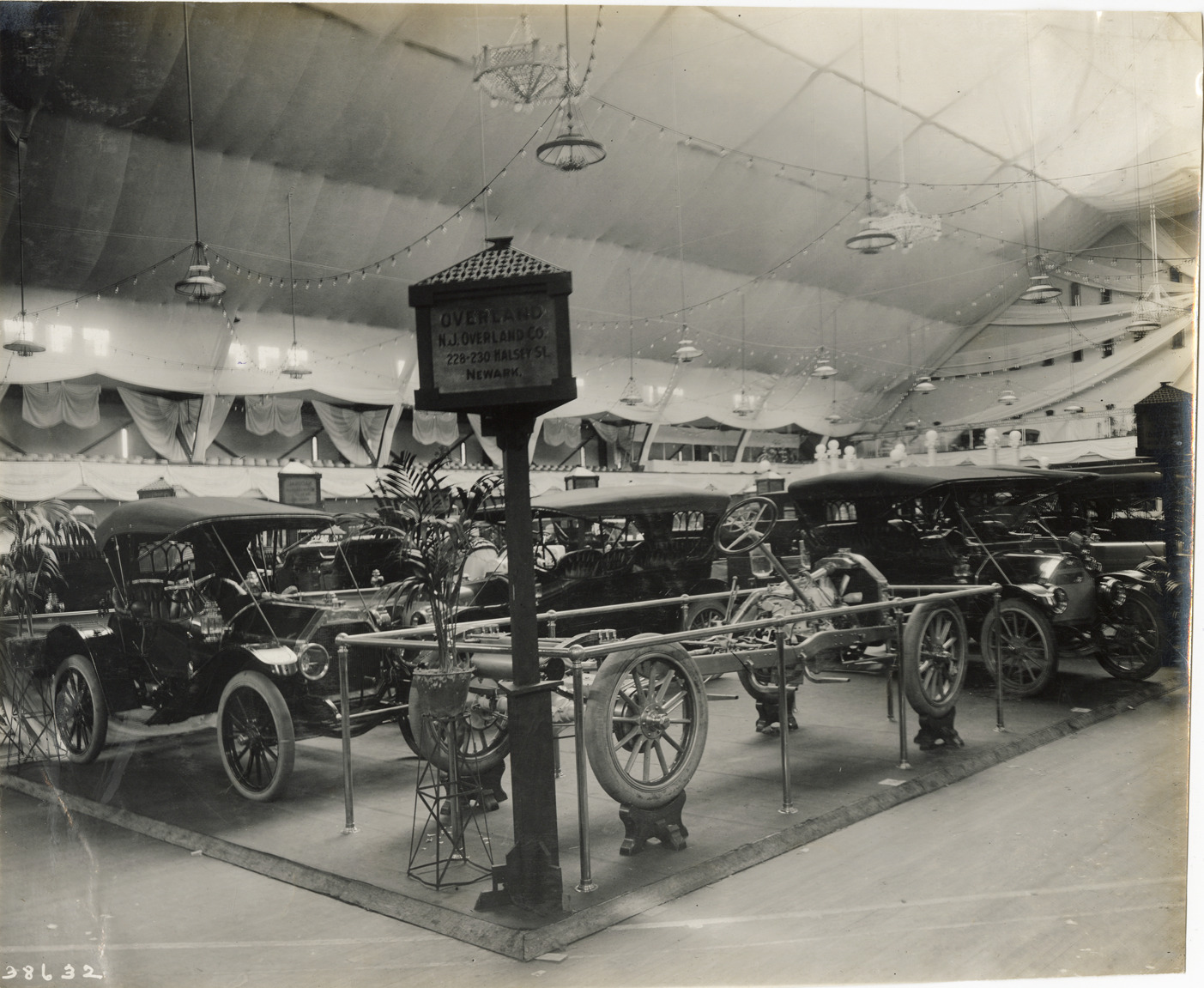 Favorite this☆ 1911 Overland automobiles and chassis at trade show Description: View of 1911 Overland cars and chassis on exhibit at trade show. Sign reads: "Overland. N.J. Overland Co., 228-230 Halsey St., Newark." Stamped on back: "Spooner & Wells, Inc., photographers, telephones 3472-3473 Columbus, 1931 Broadway, New York." Handwritten on back: "Overland, 1911." Details Resource ID: na047562 Creator: Spooner & Wells Subject: Automobiles Automobiles--Chassis Overland Automobile Company Trade shows Photographers--New York (State)--New York Photographic prints Date Issued: 1910 to 1911 Format: 1 photographic print ; 7.75 x 9.25 in. Member of: National Automotive History Collection Lazarnick Collection Filing Location: Overland Rights: Physical rights are retained by DPL. Copyright is retained in accordance with U.S. copyright laws.