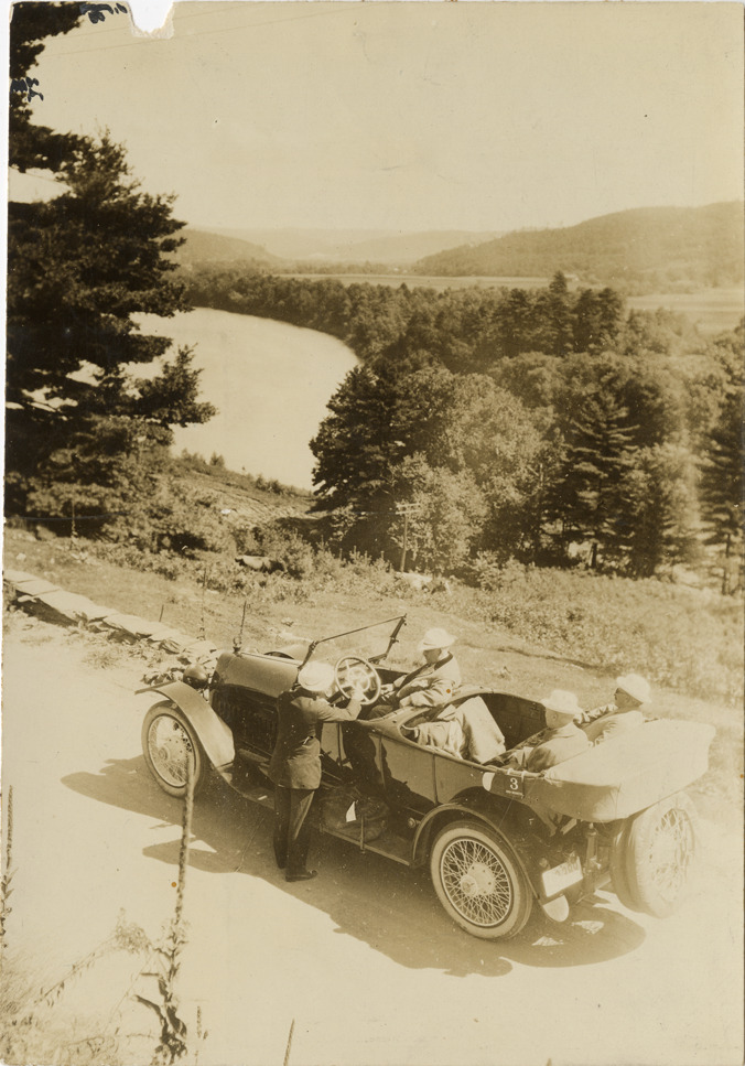 Motorists in 1917 Owen-Magnetic automobile at overlook