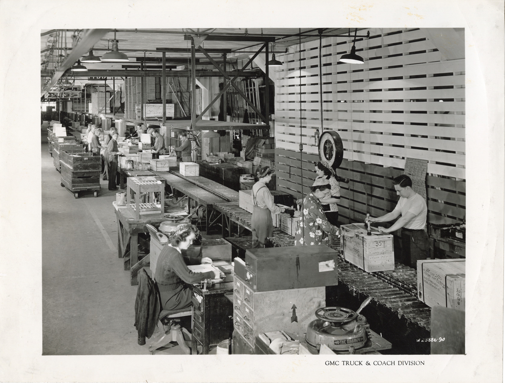 Favorite this☆ Workers packing crates on assembly line, GMC Truck & Coach Division factory Description: View of men and women packing crates on an assembly line at the GMC Truck & Coach Division factory. Printed on front: "GMC Truck & Coach Division." Details Resource ID: na047578 Subject: Automobile factories--Michigan--Detroit General Motors Corporation. GMC Truck & Coach Automobile industry workers--Michigan--Detroit Women automobile industry workers--Michigan--Detroit Assembly-line methods Photographic prints Date Issued: Unknown year Format: 1 photographic print ; 8.5 x 11 in. Member of: National Automotive History Collection Filing Location: Factories--GMC Rights: Physical rights are retained by DPL. Copyright is retained in accordance with U.S. copyright laws.