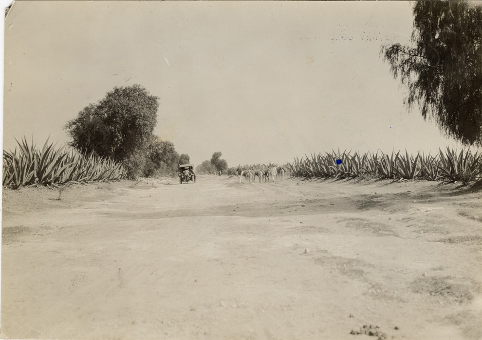 View of Chalmers-Detroit "30" pathfinder car on road lined with cacti, during the Flag-to-Flag Endurance Run from Denver to Mexico City. Stamped on back: "Spooner & Wells, Inc., photographers, telephones 3472-3473 Columbus, 1931 Broadway, New York." Handwritten on back: "Flag to Flag in 1909."