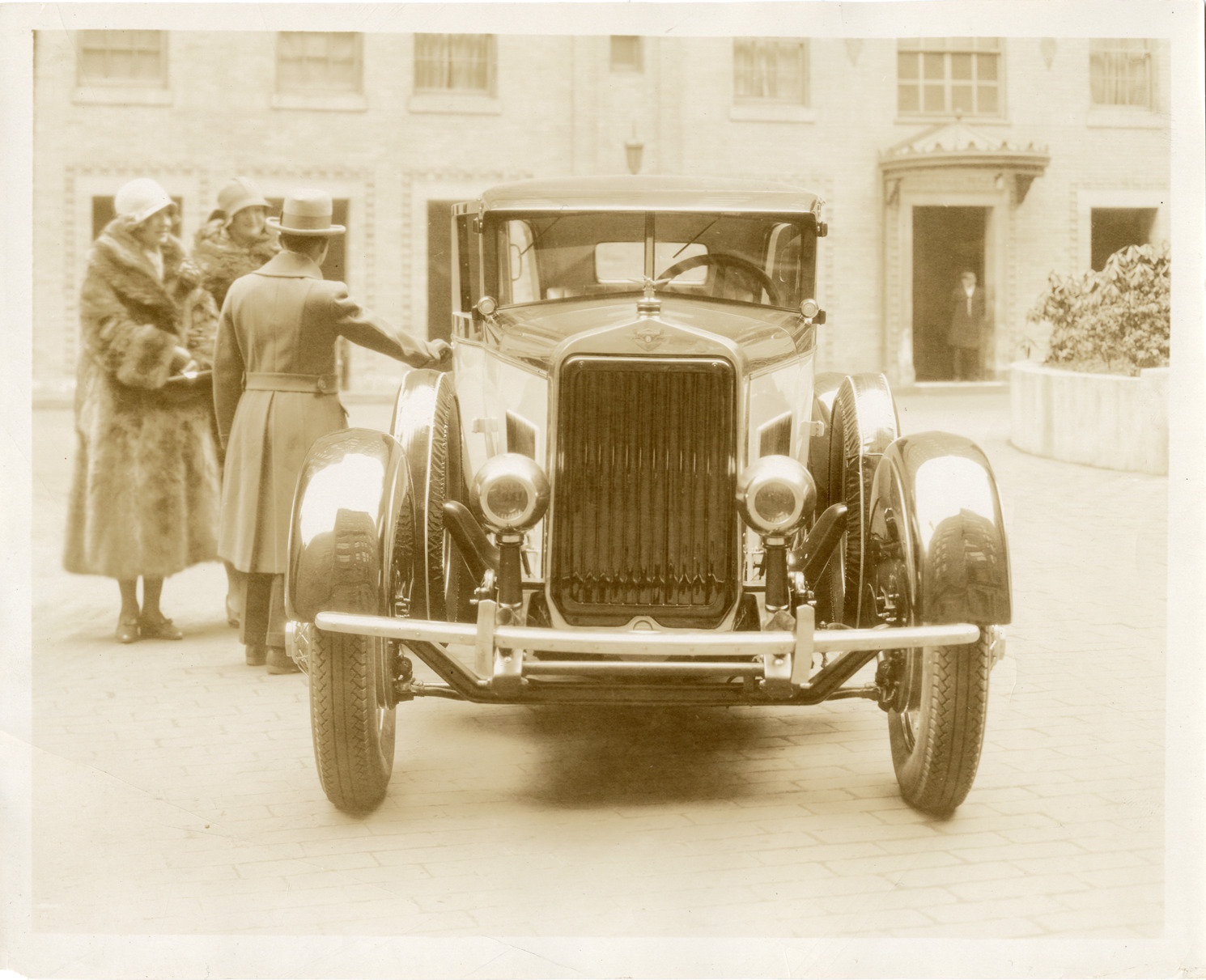 View of a man and two women with a Rickenbacker sport sedan. Handwritten on back: "Rickenbacker, app. 1927. Sport sedan."