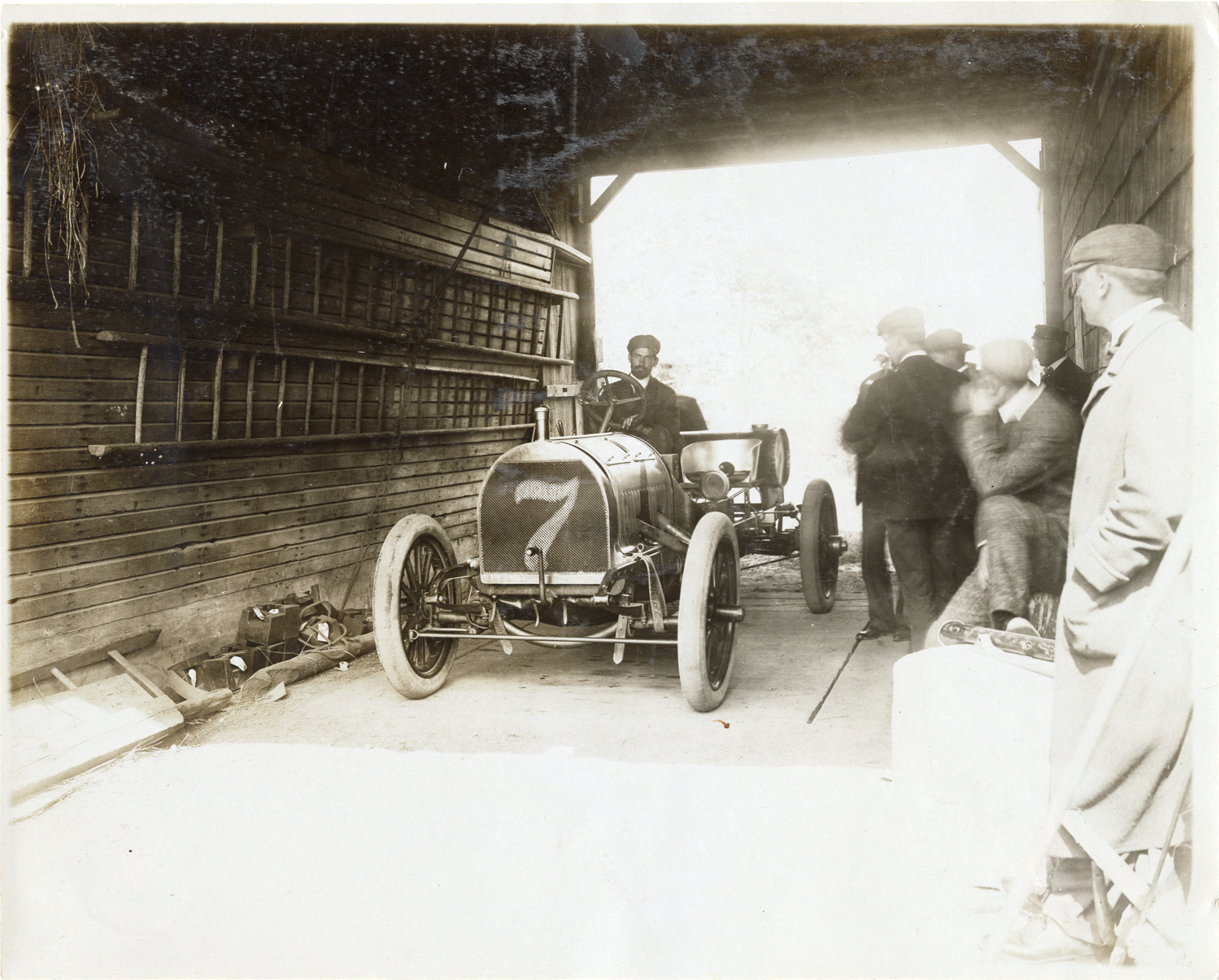 Favorite this☆ Driver posing in Royal Tourist racecar Description: View of a driver posing in Royal Tourist car no. 7 in garage. Onlookers on right. Handwritten on back: "Royal Tourist, ca. 1905." Details Resource ID: na047682 Subject: Automobiles, Racing Royal Tourist Car Company Photographic prints Date Issued: Unknown year Format: 1 photographic print ; 8 x 10 in. Member of: National Automotive History Collection Lazarnick Collection Filing Location: General photograph files, Royal Tourist Rights: Physical rights are retained by DPL. Copyright is retained in accordance with U.S. copyright laws.