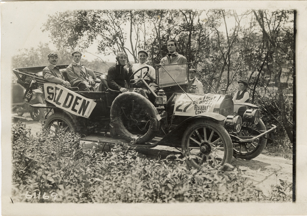 View of motorists posing in Selden car no. 27 during the 1910 Montauk Point Reliability Run. Sponsored by the Motor Contest Association, the two-day endurance run, also known as the "Montauk Light or Bust" reliability run, took place on Long Island. Stamped on back: "Spooner & Wells, Inc., photographers, telephones 3472-3473 Columbus, 1931 Broadway, New York." Handwritten on back: "Selden, ca. 1910."