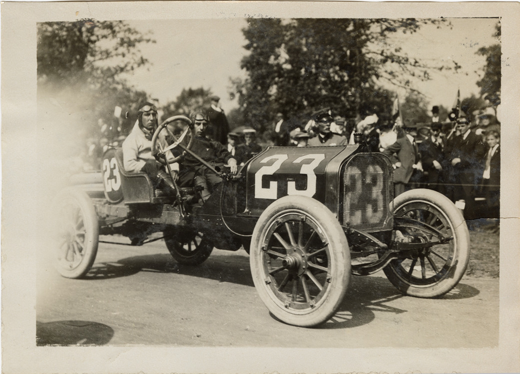 View of driver and passenger posing in Selden car no. 23 during the 1909 Fairmount Park races in Philadelphia, Pennsylvania. Stamped on back: "Photo by Spooner & Wells, Inc. 1931 Broadway, N.Y." Handwritten on back: "Selden, '09. Fairmount."