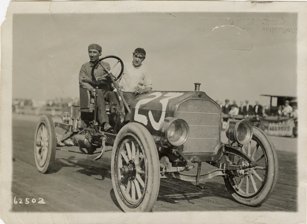 View of driver Charles Young and passenger posing in Selden car no. 23 during the 6 hour race in Philadelphia, Pennsylvania. Stamped on back: "Spooner & Wells, Inc., photographers, telephones 3472-3473 Columbus, 1931 Broadway, New York." Handwritten on back: "Chas. Young, Selden car, 6 hour race, Philadelphia, 8-6-10."