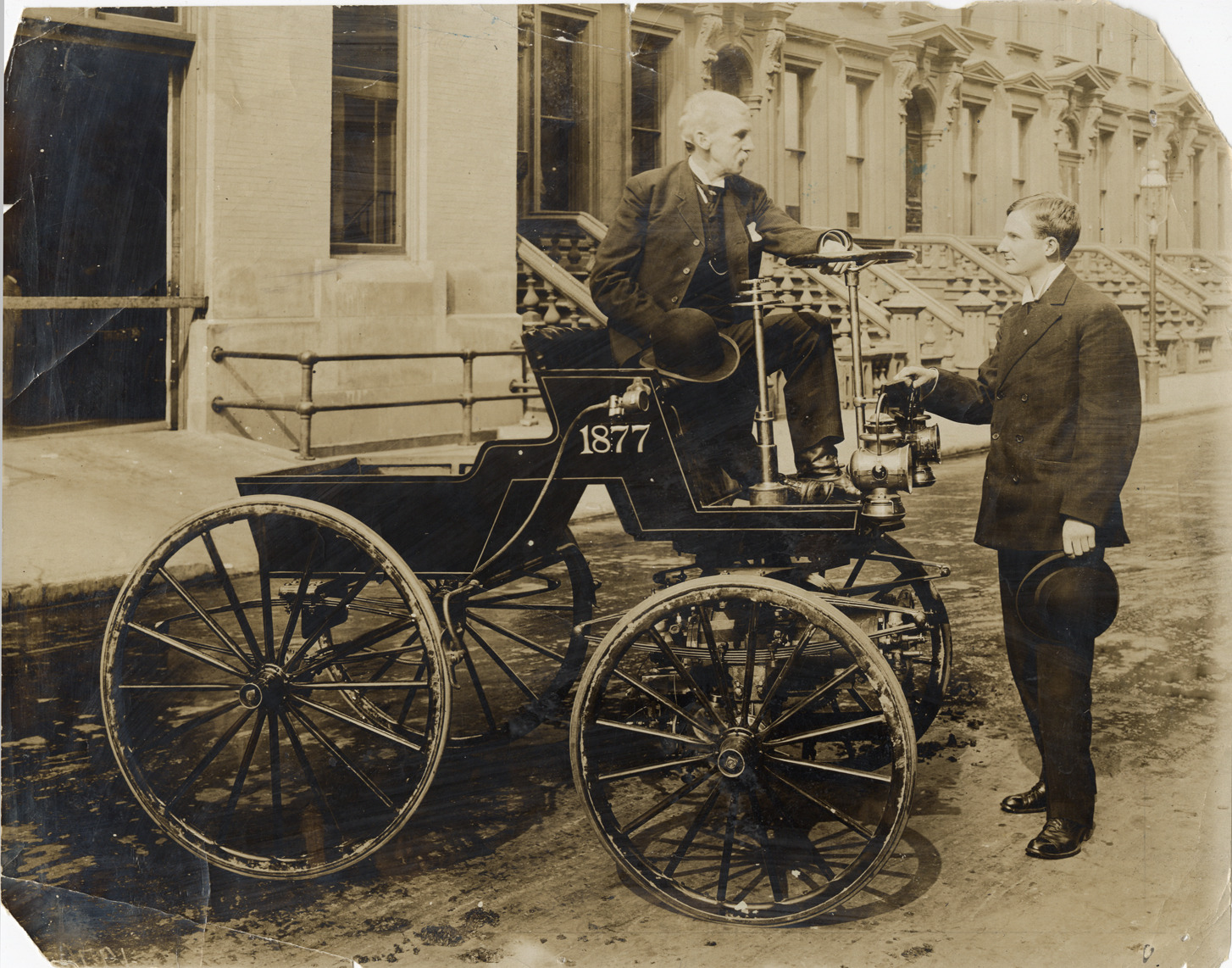 George B. Selden and Henry R. Selden posing with "1877" Selden motor wagon
