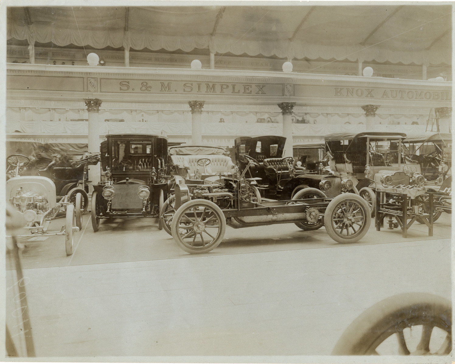 Favorite this☆ Simplex automobiles and chassis at trade show Description: View of Simplex cars and chassis on display at trade show. "S. & M. Simplex" sign in background. Stamped on back: "Photo by F. Ed. Spooner, 1536 B'way, telephone 6536-38th St., New York, N.Y." Handwritten on back: "Simplex, ca. 1906." Details Resource ID: na047743 Creator: Spooner, F. Ed. Subject: Automobiles Smith & Mabley Manufacturing Company Photographers--New York (State)--New York Photographic prints Date Issued: Unknown year Format: 1 photographic print ; 8 x 10 in. Member of: National Automotive History Collection Lazarnick Collection Filing Location: General photograph files, Simplex, 1906 Rights: Physical rights are retained by DPL. Copyright is retained in accordance with U.S. copyright laws.