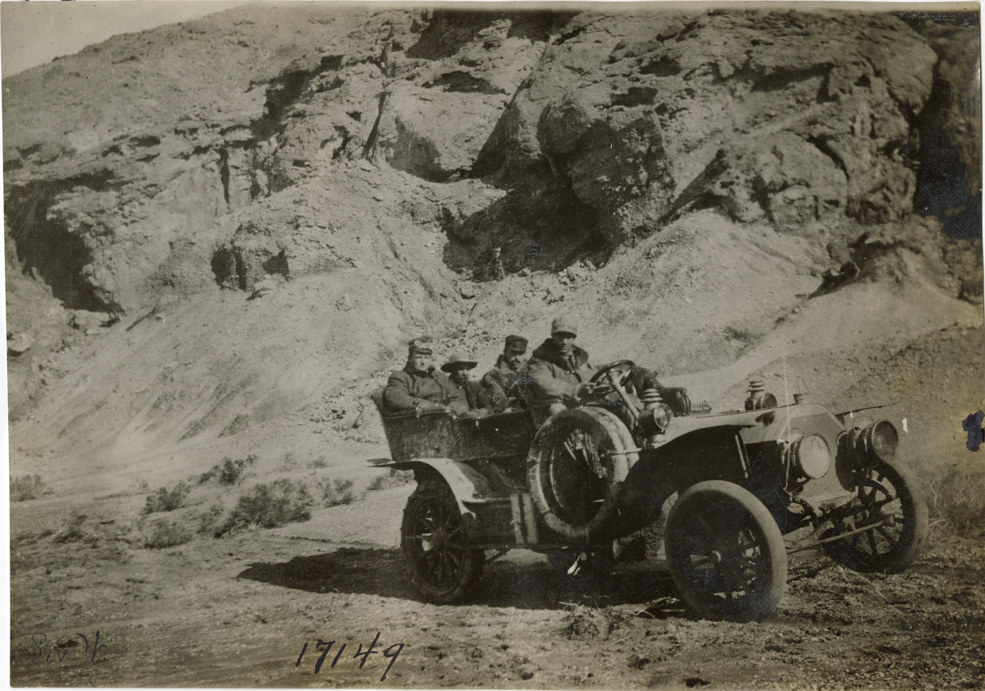View of motorists posing in a 1907 Simplex car. Rock formations in background. Stamped on back: "Spooner and Wells, 1931 Broadway, New York, duplicates any time, enlargements all sizes, tel. 3472-3473 Col., credit appreciated." Handwritten on back: "S & M Simplex, 1907."