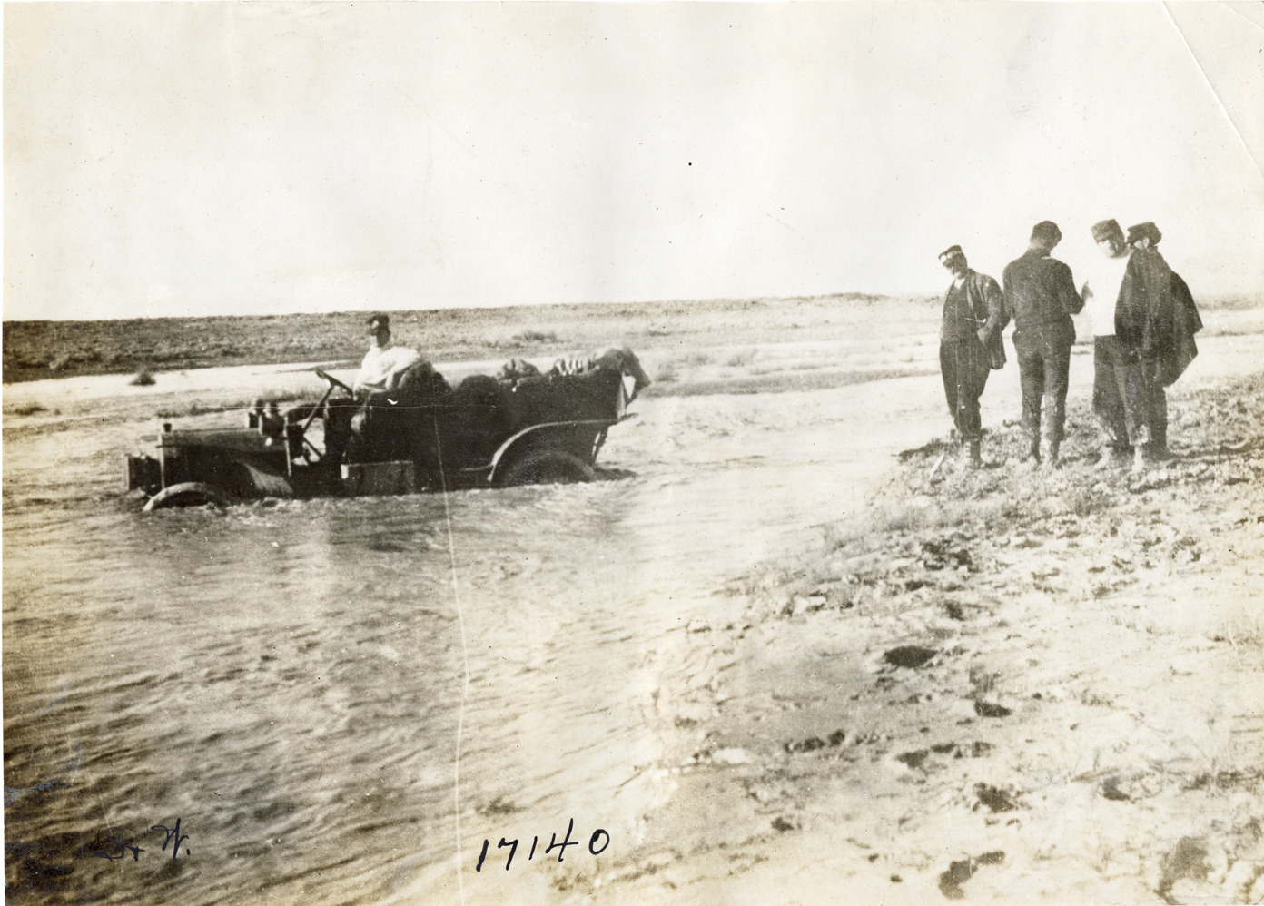 View of a motorist in a1907 Simplex car fording a stream; group of motorists on right. Stamped on back: "Spooner and Wells, 1931 Broadway, New York, duplicates any time, enlargements all sizes, tel. 3472-3473 Col., credit appreciated." Handwritten on back: "Simplex, 1907."