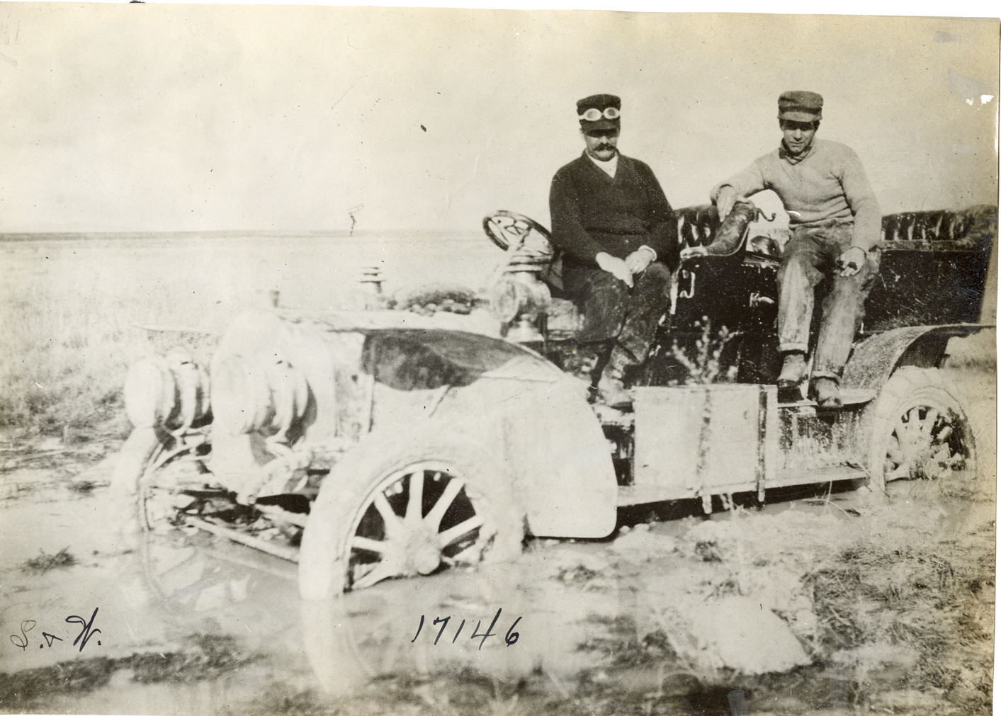 View of motorists posing with a 1907 Simplex car on a flooded road. Stamped on back: "Spooner and Wells, 1931 Broadway, New York, duplicates any time, enlargements all sizes, tel. 3472-3473 Col., credit appreciated." Handwritten on back: "S & M Simplex, 1907."