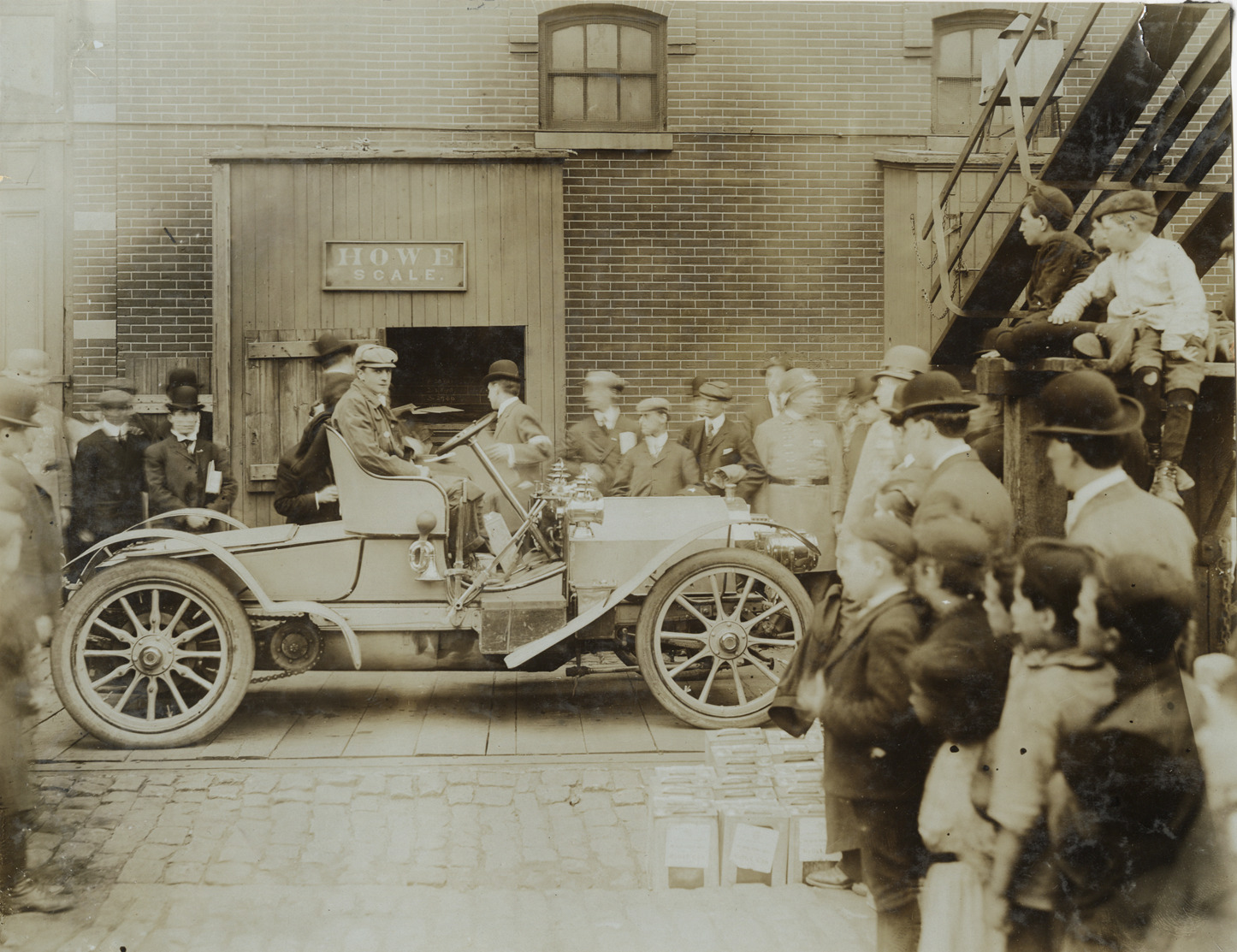 View of Al Poole and motorists in a Simplex runabout, surrounded by onlookers. Car is being weighed on Howe scale. "Howe scale" sign in background. Fuel cans in foreground. Stamped on back: "Photo by F. Ed. Spooner, 1536 B'way, telephone 6536-38th St., New York, N.Y." Handwritten on back: "Simplex, ca. '06. Poole in S & M Simplex runabout 30 h.p."