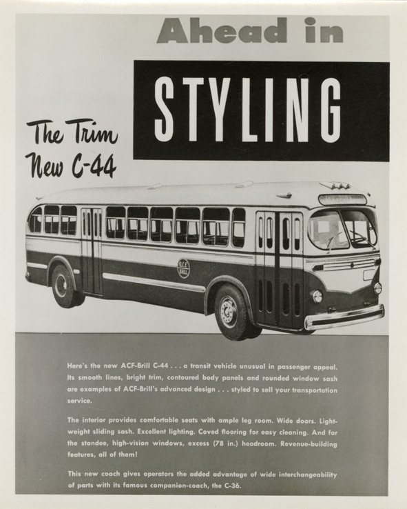 Favorite this☆ Advertisement for ACF-Brill C-44 bus Description: View of an advertisement for an ACF-Brill bus. Printed on front [in part]: "Ahead in styling, the trim new C-44." Handwritten on back: "From ad in 'Bus Transportation', Dec. 1947." Details Resource ID: na047817 Subject: Buses ACF-Brill Motors Company Advertising--Bus lines Photographic prints Date Issued: Unknown year Format: 1 photographic print ; 5 x 4 in. Member of: National Automotive History Collection Filing Location: MS121/VanDegrift, Thomas, 5:2 Rights: Physical rights are retained by DPL. Copyright is retained in accordance with U.S. copyright laws.