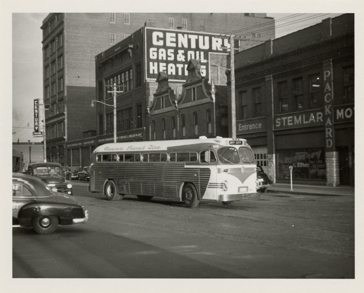 View of an Aerocoach bus for the Missouri Transit Line. Stamped on back: "W.A. Luke." Handwritten on back: "Aerocoach. Cedar Rapids, Iowa. Jan. 1954."