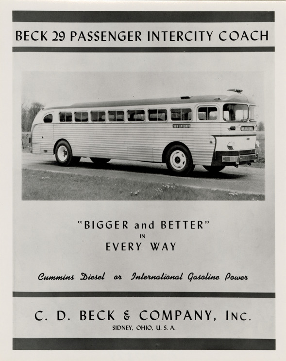 Favorite this☆ Beck bus Description: Advertisement for a Beck bus. Printed on front: "Beck 29 passenger intercity coach. Bigger and better in every way. Cummins Diesel or International Gasoline Power. C.D. Beck & Company, Inc. Sidney, Ohio, U.S.A." Details Resource ID: na047874 Subject: Buses C.D. Beck & Company Advertising Photographic prints Date Issued: Unknown year Format: 1 photographic print ; 5 x 4 in. Member of: National Automotive History Collection Filing Location: MS121/VanDegrift, Thomas, 5:7 Rights: Physical rights are retained by DPL. Copyright is retained in accordance with U.S. copyright laws.