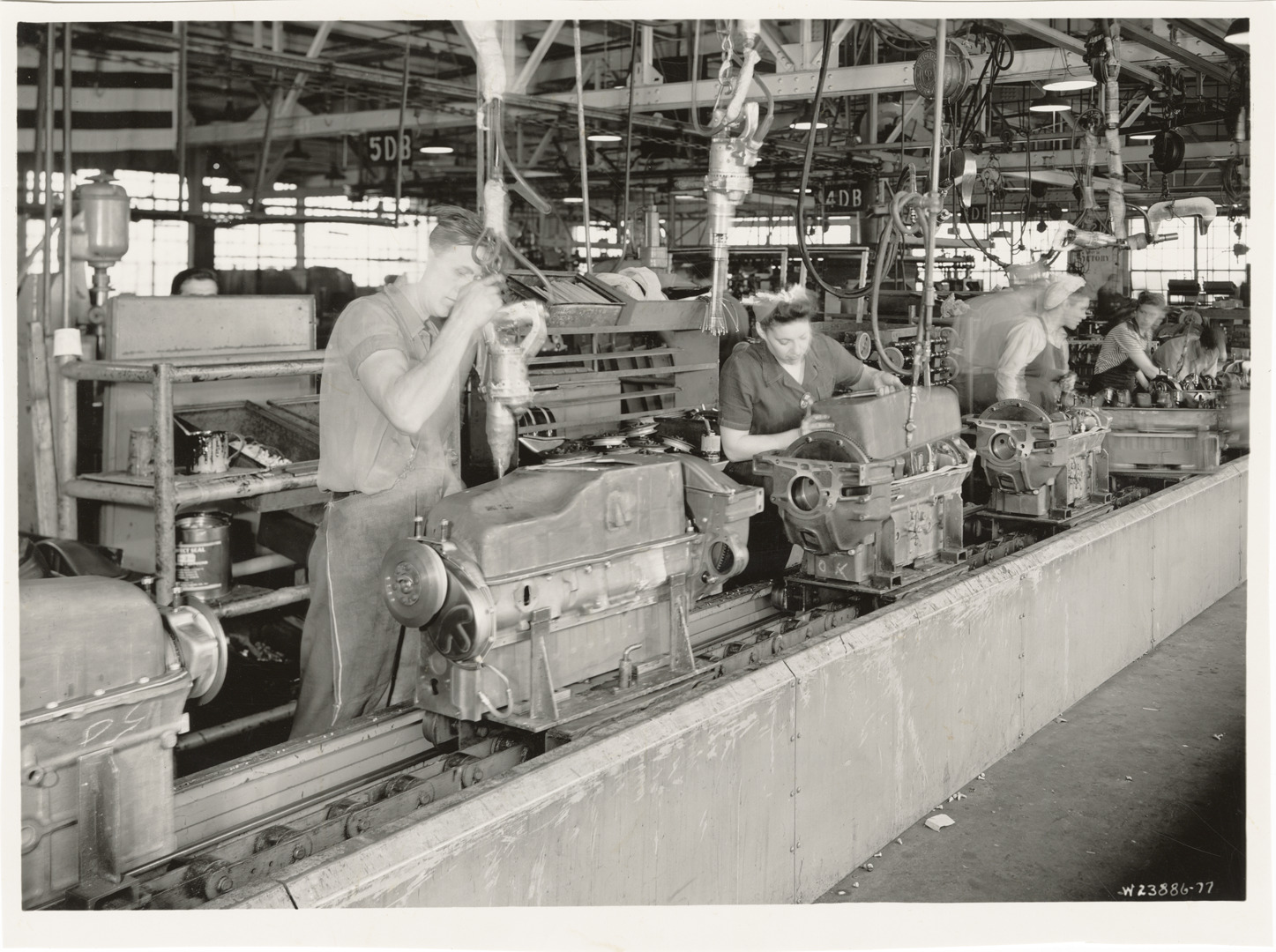 View of men and women workers assembling oil pans at the Plant 4 Engine Assembly Bldg. 20, GMC Truck & Coach plant. Handwritten on back: "Plant 4 Engine Assembly Bldg. 20, third floor. Oil pan assembly on assembly line. Factories--GMC, ca. 1943."