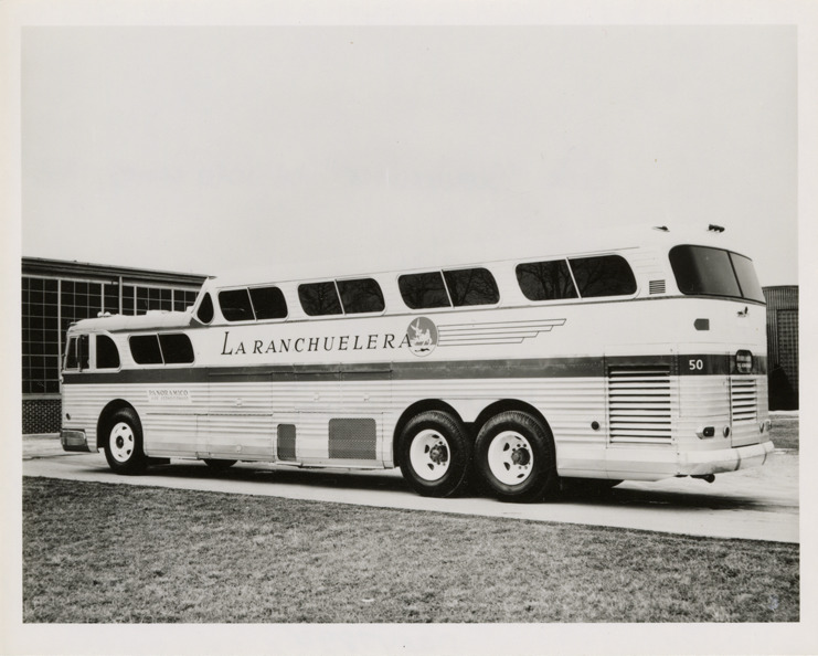 View of a 1955 Beck "Semicruiser" bus for Compania de Transporte Omnibus la Ranchuelera, S.A. Handwritten on back: "Beck 'Semicruiser' DH-1040 series, 1955. Cuba."